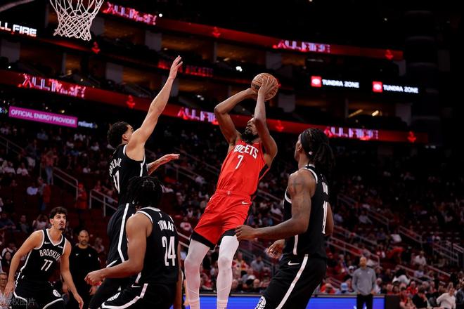 火箭主场迎战篮网,火箭先发:杜兰特、史密斯、申京、奥科吉、阿门;篮网先发:曼恩、波特、克拉克斯顿、萨拉夫、托马斯! 首节开局,申京篮下打进以后,火箭一直不得分,篮网7-2领先。杜兰特中投打进,申京2+1,篮网连得4分以后,阿门连着两个突破扣篮,奥科吉三分命中,16-16以后进入暂停。回到比赛,火箭提升了防守强度,杜兰特罚球以后助攻奥科吉三分再中,火箭打了一波11-3的小高潮拉开分差。篮网连续两记三分追分,谢泼德助攻杜兰特扣篮打停对手。暂停以后,阿门反击助攻谢泼德三分命中,伊森外线连续命中两个三分,首节结束42-25领先17分。
