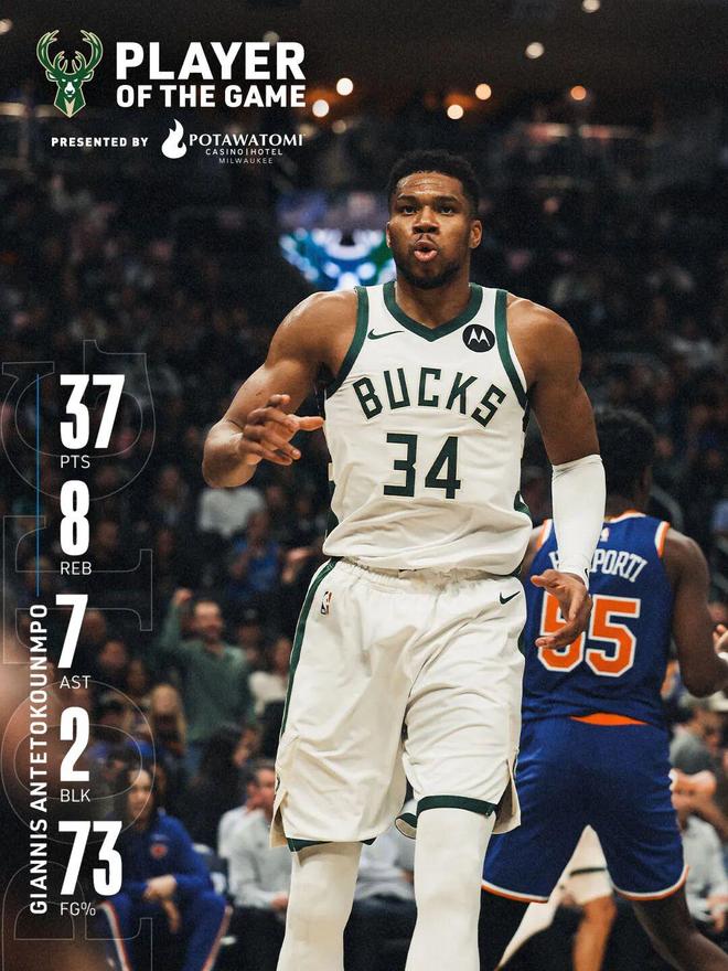 常规赛,雄鹿主场121-111战胜尼克斯。 这场比赛,字母哥又一次交出了现象级表现:全场出战33分钟,投篮22中16,罚球7中5,得到37分8篮板7助攻2盖帽1抢断。