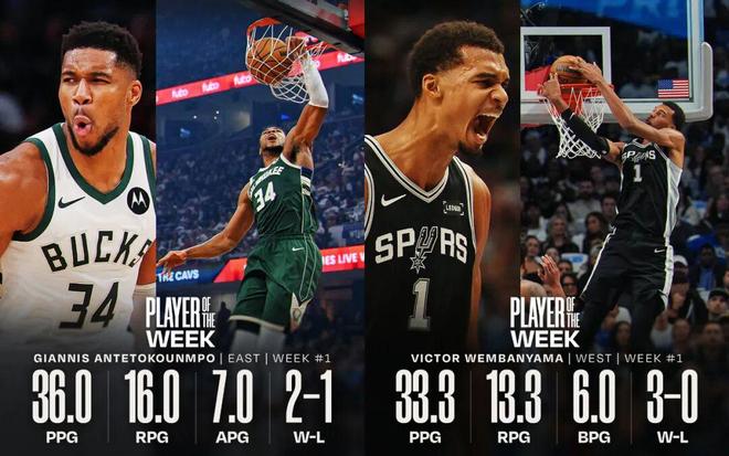 还有一个有些定制的数据是:字母哥开局四场一共得到145分56篮板28助攻,他是NBA历史上第一个开局四场得到140+得分、50+篮板、25+助攻的球员。 因为前三场表现出色,字母哥还当选了第一周的东部周最佳球员,西部与他一同当选的是今年开局另一MVP大热文班亚马。
