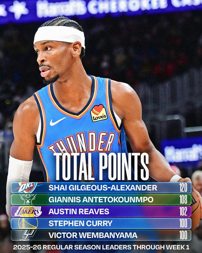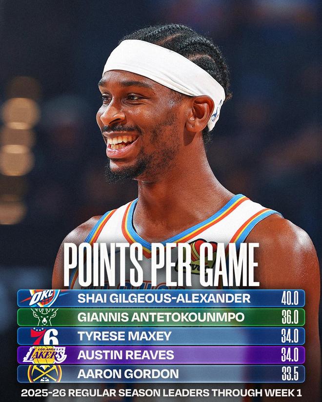 NBA首周球员数据:亚历山大得分王,字母哥篮板