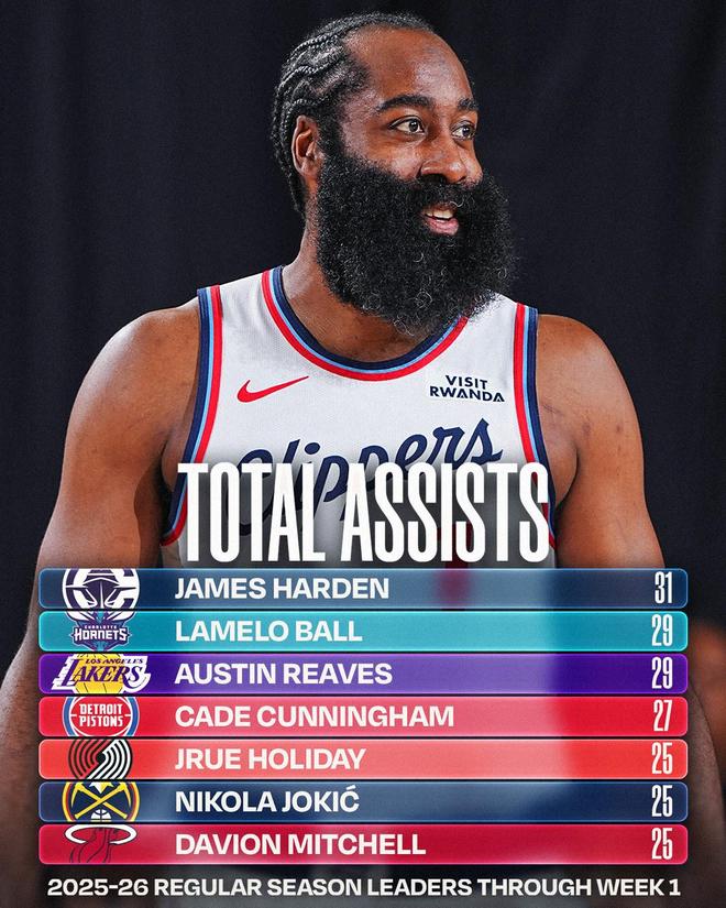 总助攻榜 哈登 31 拉梅洛-鲍尔 29 里夫斯 29 坎宁安 27 朱-霍勒迪 25 约基奇 25 达维昂-米切尔 25 场均助攻榜 约基奇 12.5 哈登 10.3 拉梅洛-鲍尔 9.7 里夫斯 9.7 基扬特-乔治 9.5