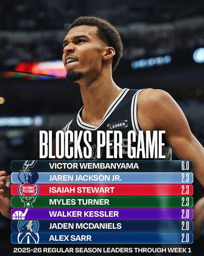 总盖帽榜 文班亚马 18 小贾伦-杰克逊 7 斯图尔特 7 迈尔斯-特纳 7 杰登-麦克丹尼尔斯 6 亚历克斯-萨尔 6 场均盖帽榜 文班亚马 6.0 小贾伦-杰克逊 2.3 斯图尔特 2.3 迈尔斯-特纳 2.3 凯斯勒 2.0 杰登-麦克丹尼尔斯 2.0 亚历克斯-萨尔 2.0 |