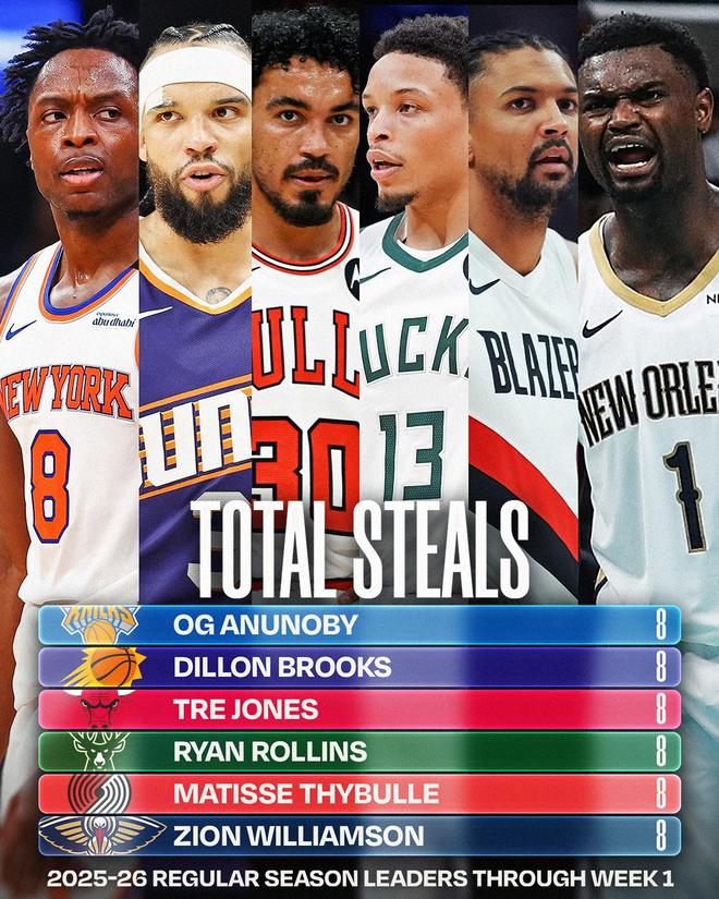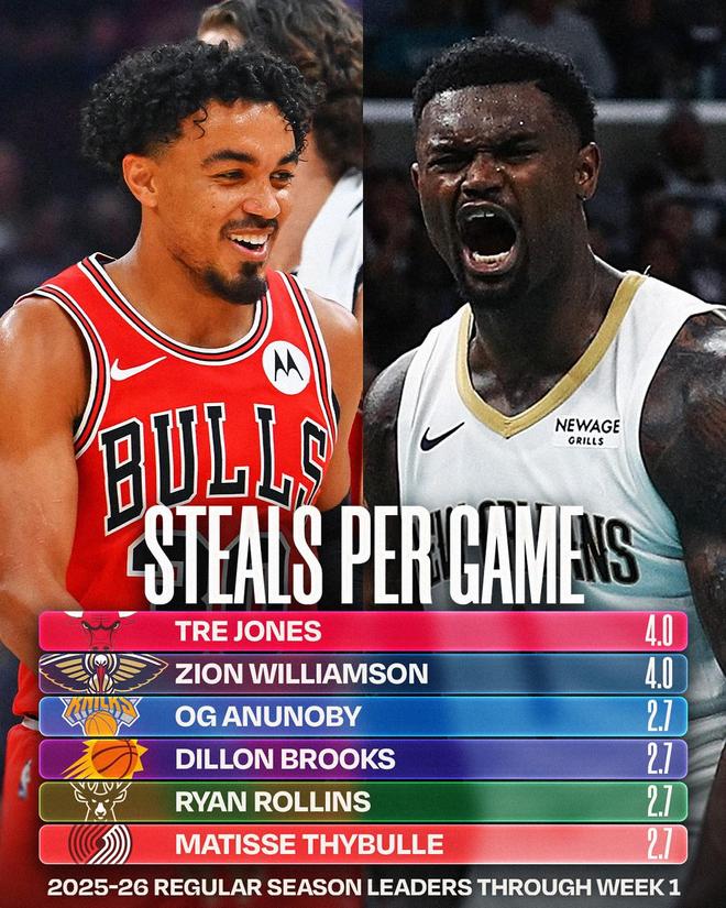 总抢断榜 OG-阿奴诺比 8 狄龙-布鲁克斯 8 特雷-琼斯 8 莱恩-罗林斯 8 赛布尔 8 锡安-威廉森 8 场均抢断榜 特雷-琼斯 4.0 锡安-威廉森 4.0 OG-阿奴诺比 2.7 狄龙-布鲁克斯 2.7 莱恩-罗林斯 2.7 赛布尔 2.7