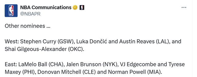 西部:库里、东契奇、里夫斯、亚历山大 东部:三球、布伦森、埃奇库姆、马克西、米切尔、诺曼-鲍威尔 |