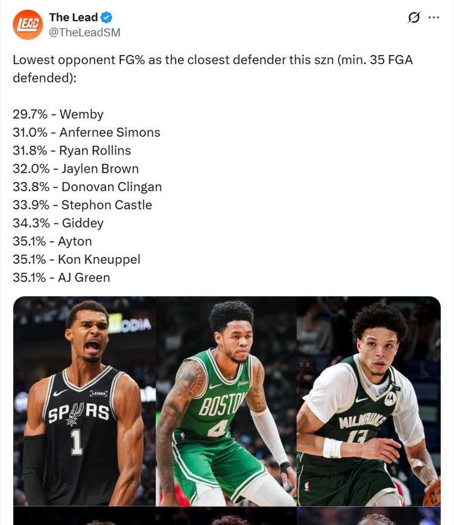 作为低位大杀器,文班亚马的远投效率还在提升,这让他更难以被防守。身高2米26的文班亚马,作为联盟现役最高的球员,不仅仅有着出色的内线终结技术,还精通后卫的外线持球单打技巧。文班亚马堪称是场上BUG,他在内、外线都能够完成得分。半场之内,都是文班亚马的得分区域。 值得关注的是,文班亚马还有2项数据高居联盟第1。第1、文班亚马场均送出4.8次封盖,排名联盟第1。第2、美媒The Lead列出了一项防守数据统计,本赛季在防守对位时让对手投篮命中率最低的球员(至少防守35次出手)排行,其中文班亚马(29.7%)排在第一。 文班亚马是NBA顶级防守者