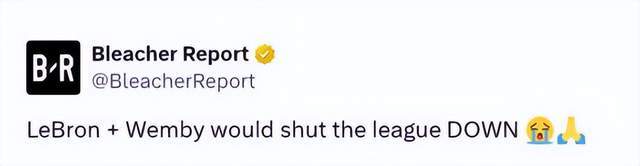 10月28日,在湖人落败开拓者之后,知名美媒Bleacher Report更新社交账号,发文写道: “詹姆斯和文班亚马这对组合能直接统治联盟啊!马刺应该寻求交易詹姆斯,让这两位状元联手。” 虽然只是一则媒体的预想消息,但足以引起球迷圈热议。主要还是在于文班亚马本赛季的开局实在是太疯狂了。