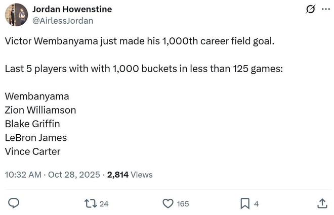 第二大利好:文班配得上MVP榜第一 马刺队之所以能够强势反弹,完全得益于内线核心文班的回归,在摆脱血栓困扰,又经历少林寺历练洗礼后,本赛季文班亚马开季表现堪称炸裂。 本场比赛面对实力不佳的猛龙队,文班亚马小试牛刀仅出手8次,命中7球拿下24分15篮板4助攻1抢断1盖帽大号两双。 尽管本场数据不够炸裂,但凭借前三场数据的积累,四场比赛过后文班再次打破NBA纪录,成为NBA历史上第五位能够在生涯前125场内命中至少1000球的球员,前四人分别是锡安、格里芬、詹姆斯和卡特。