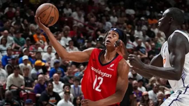 第三位,特雷-约翰逊,华盛顿奇才队,2025年首轮第6顺位 虽然艾斯-贝利想要加盟奇才的如意算盘落空,球队转头将特雷-约翰逊,这位进攻端颇具才华的新人摘下,虽然重建期的奇才,拥有萨尔、卡林顿、乔治等多位新人,特雷-约翰逊只能出任球队第六人,不过以目前他的表现而言,提上首发只是时间问题。 目前三场比赛,特雷约翰逊场均能得到17分4篮板2助攻,投篮命中率47.3%三分球命中率42.9%,在进攻端,他在无球情况下的跑位能力,配合精准的射术,让他即便在没有球权时,也能对对手防线造成巨大影响。相信之后随着球权逐渐增加,特雷-约翰逊将是今年最佳新秀的有力争夺者之一。
