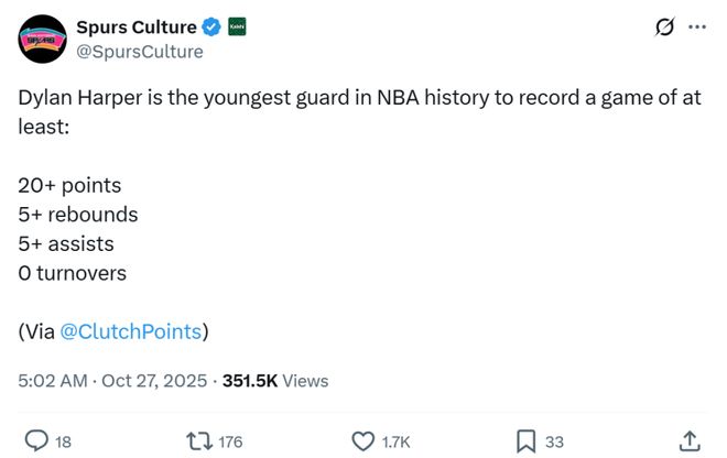 榜眼也破纪录 由于文班亚马的表现太过耀眼,让人们忽视了马刺队新科榜眼秀哈珀的出色表现。 本场比赛,哈珀持续交出稳健又扎实的表现,11中8拿下20分6篮板8助攻2抢断全能数据,大有超过卡斯尔成为马刺队未来二当家的势头。