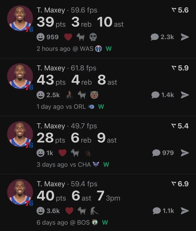 常规赛揭幕战,76人117-116险胜凯尔特人,马克西24投13中砍下40分2篮板6助攻;第二场76人125-121击败黄蜂,马克西20投7中得到28分6篮板9助攻;第三场76人136-124轻取魔术,马克西32投15中狂砍43分4篮板8助攻。