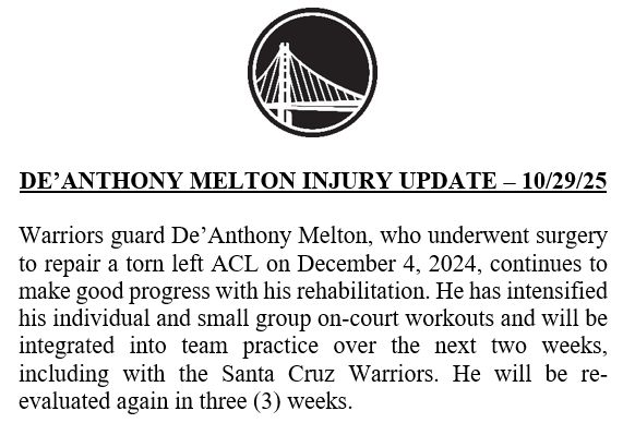 根据勇士队的消息,梅尔顿目前已开启“个人训练”和“小团体训练”;球队计划在未来几周内,将他逐步纳入球队合练,且合练将同时覆盖NBA主队与发展联盟的圣克鲁斯勇士队——后者的训练频率高于金州勇士主队。 球队表示,将在三周后对梅尔顿的恢复情况重新评估,这意味着他的常规赛首秀最早是11月末。这一时间线与主帅科尔10月1日的说法一致:科尔在训练营期间曾提到,这位27岁后卫“有望在未来两个月内做好参赛准备”。 2024-25赛季开局阶段,梅尔顿便已加入勇士队,且去年秋天的表现一度让人觉得他“完美适配球队阵容”。但他仅出战6场常规赛,就因左膝前交叉韧带撕裂赛季报销。 受伤期间,梅尔顿被勇士队交易至篮网队(交易目的为薪资匹配);不过今年夏天,他以自由球员身份重返金州,与勇士队签下一份“两年底薪合同”,合同中包含“第二年球员选项”。