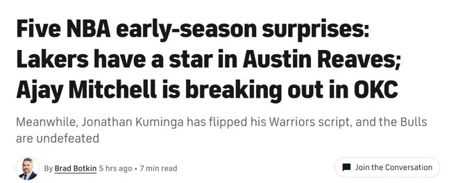 这样的防守效率或许难以长久维持,但公牛如今的表现确实亮眼:阵容深度雄厚,队中藏着不少实力派球员,其中6人(武切维奇、吉迪、多森姆、赫尔特、布泽利斯、特雷-琼斯)场均得分均达到至少13分。他们会全力干扰每一次投篮,篮板率也高居联盟前7,进一步巩固了防守成果。 不过公牛接下来的赛程将变得艰难:未来10场比赛中,他们要两次对阵尼克斯,还要迎战76人、雄鹿、骑士、马刺、活塞和掘金。目前还无法确定他们的开局火热是真实实力的体现,还是又一次“伪强队”式的短暂爆发,但有一点可以肯定:这支公牛队本赛季大概率会给不少对手制造麻烦。 4.阿贾伊-米切尔崭露头角 雷霆本就拥有年轻的争冠阵容,未来7年还手握11个潜在首轮签,正当人们以为他们的天赋储备已达上限时,米切尔横空出世,成为赛季初期最亮眼的“黑马”球员之一。