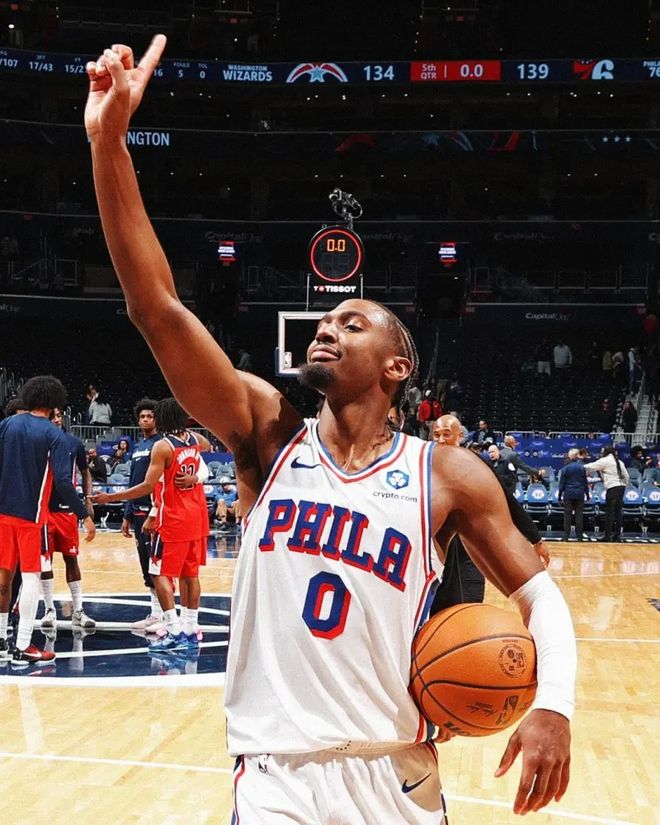 NBA官方社交媒体晒出泰雷斯-马克西高举手指比出“第一”手势的庆祝画面,配文简短而有力:“76人现在是东部第一。”这张照片背后,是费城76人开季4胜0负的完美战绩,更是一个25岁后卫的超级进化史。 四场比赛,场均37.5分3.8篮板8.3助攻,这就是马克西交出的成绩单。揭幕战对阵凯尔特人,他轰下40分6助攻,三分球9投7中;对阵黄蜂拿下28分6篮板9助攻;