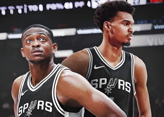从球员属性来看,福克斯和文班二人都能够在稳定结构中发挥价值,但两人都未必能单独支撑一套体系结构。文班最高效的模式,是需要一位纪律严谨的控卫替他掌控球队节奏;而福克斯需要更多能够突破天赋的队友搭档,才能让他的稳定成为优势。 但如果单纯的把文班和福克斯,甚至是球星成色稍低一档的哈珀、卡斯尔放在一起,马刺反而很可能会误用这位划时代天才球员。 在上赛季因血栓赛季报销之前,文班和福克斯一共只搭档了五场比赛。而在这120分钟里,这对二人组的场上净胜分反而是负数。结合有限的球员数据看,文班和福克斯同场时,文班的得分和命中率都有明显下降,反倒是福克斯的得分和助攻数据都能够有提升。 对比来看,新赛季的马刺的确比上赛季同时期要更出色,但这支球队的整体战力,终究还是需要一整个赛季的考验才能得知最终上限。 摊开阵容班底来看,一支拥有两位入选全明星的球星+现任最佳新秀+未来最佳新秀的大热门,这样的核心班底再加上一群全面的锋线轮换,而在这样一支球队里,最恐怖的是,文班亚马还在持续提升自己。