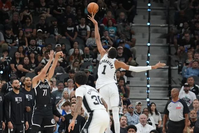 圣安东尼奥马刺用4胜0负的完美开局震惊联盟,场均净胜对手16.5分的恐怖表现让他们高居西部第二。这支被预言还要摆烂的球队,竟然追平了队史最佳开局纪录。面对即将到来的主场对阵热火,文班亚马放出豪言:“马刺从未5胜0负?那就让我们来创造历史!” 这个法国天才正在重新定义篮球。开季四场比赛狂送19记盖帽,场均4.75次封盖的数据让第二名凯斯勒的2.7次相形见绌。当对手看到文班亚马镇守禁区时,连突破都变得犹豫——第四场对阵猛龙,对方直接放弃内线进攻,导致文班全场只有1次盖帽,差点中断他连续89场盖帽的现役最长纪录。