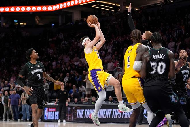 翻看比赛,映入眼帘的就是里夫斯在比赛结束后朝着替补席狂奔而去。然后高高跃起,和队友撞胸庆祝。 当时里夫斯心中,肯定想起了洛杉矶湖人队史多位超级巨星,奥尼尔、科比、费舍尔、詹姆斯。因为那一刻,里夫斯就是他们。就在今日早些时候结束的一场比赛里,湖人116-115绝杀森林狼,拒绝逆转。在多人缺席的情况下,湖人靠着残阵击败了这位近几年难缠的对手。