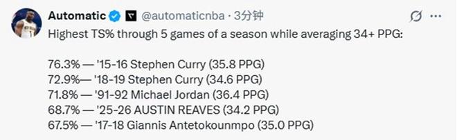 纪录四:开季前5场比赛拿到171分,湖人队史第四,仅次于埃尔金贝勒172分、科比174分和杰里韦斯特175分; 纪录五:前五场场均至少拿到34分,里夫斯真实命中率68.7%历史第三,仅次于库里和乔丹; 纪录六:前五场至少拿到150分50次助攻,湖人队史首人; 纪录七:开季连续5场交出25+得分表现,湖人队史第7人,05年科比后首人。