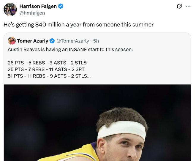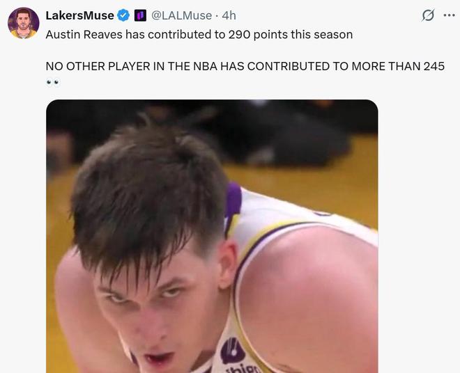 凭借这样的表现,里夫斯一战狂刷7项纪录,彻底打出个人身价。 纪录一:全场送出16次助攻为里夫斯生涯新高; 纪录二:过去3场拿到120分,场均40分10助攻,为湖人队史杰里韦斯特后第二位能够交出如此傲人表现的球员; 纪录三:开季至今5场比赛,里夫斯通过得分+助攻创造290分,断档高居联盟第一。