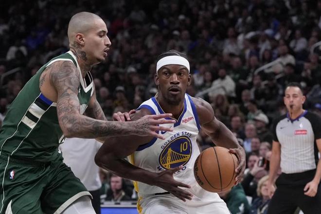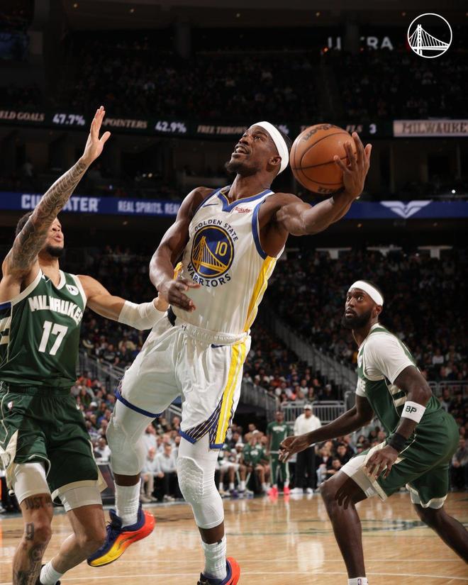 罗林斯在决胜时刻轰进远投,帮助雄鹿收割了比赛。成为了此战胜负手的罗林斯,在进攻端彻底打疯了。无论是冲击篮下,还是外线远投,他都有着很高的效率。此外,罗林斯在此战还创下了纪录。罗林斯此役的得分创下了个人生涯新高。 巴特勒23+11尽力了 勇士队锋线巨头吉米巴特勒,在此战拼尽全力。巴特勒出战36分钟,18投7中,三分2投1中,罚球8罚8中,轰下了23分11篮板3助攻1抢断1盖帽的两双数据。 巴特勒砍下了全队的第二高分,他的罚球命中率为100%,巴特勒展现了强烈的求胜欲望。并且,巴特勒还是此战的篮板王。同时,巴特勒的7个前场篮板冠绝全场。 巴特勒强攻内线