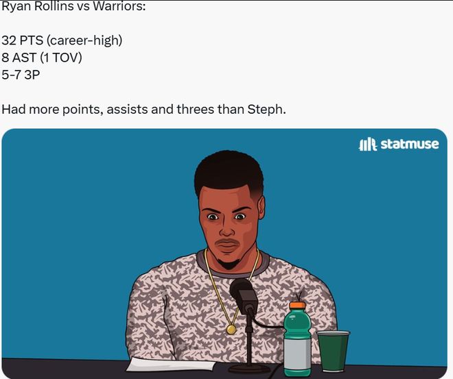 在本场比赛中,勇士旧将罗林斯发挥神勇,他首发登场36分钟,21投13中,其中三分7中5,另外罚球3中1,砍下32分3篮板8助攻,其中得分连续第二场刷新生涯纪录(上一场25分)。 在本场比赛最后时刻,罗林斯先是顶人三分出手命中,比赛最后时刻,他面对巴特勒命中超远三分,杀死比赛悬念。