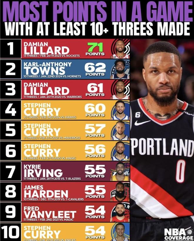 近日,NBA Coverage发布了“单场至少命中10记三分的最高得分”榜单——利拉德以71分领跑,唐斯62分紧随其后,库里四度上榜(含2025年对魔术的12记三分)。下方按对手、比分、年龄、三分命中等要素逐条列出,便于读者快速核对与对比(数据截至2025年10月17日) 榜单排名利拉德(Damian Lillard) 国籍:美国 三分命中:13 日期:2023年2月26日 对手:火箭 最终比分:131–114(胜) 当时年龄:32岁 得分:71分 唐斯(Karl-Anthony Towns) 国籍:多米尼加共和国 三分命中:10 日期:2024年1月22日 对手:黄蜂 最终比分:125–128(负) 当时年龄:28岁 得分:62分