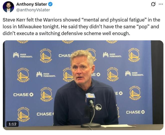 勇士大爆冷输球 前一场大胜快船拿下2连胜后,勇士队开启客场之旅前往密尔沃基挑战雄鹿,受困于左膝酸痛字母哥本场缺席比赛,结果在唯一核心字母哥缺席的情况下,最终残阵雄鹿队120-110爆冷击败勇士。 由于本场比赛前,勇士队交出5胜4负战绩,仅输掉了一场4天3战背靠背第二场的比赛,同时对手雄鹿队又缺少字母哥,这是一场实打实的爆冷。 那么为何高歌猛进状态火热的勇士队会爆冷不敌缺少字母哥的残阵雄鹿队?主帅科尔赛后通过讽刺的口吻直白给出3大败因。