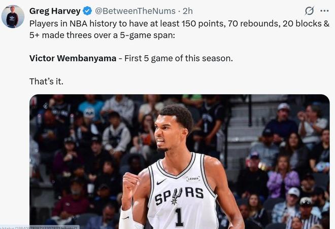 同时文班亚马也是NBA历史上首位能够在连续5场比赛中,至少拿下150分70篮板20盖帽5记三分的球员。