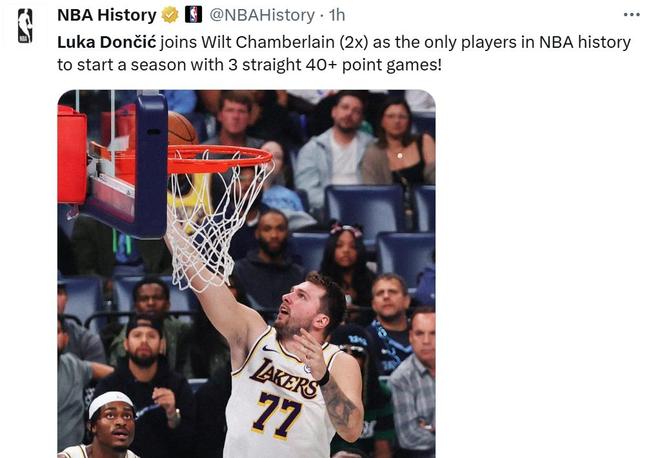凭借这样的表现,东契奇成为张伯伦后NBA历史上第二位能够在开季至少三场比赛中连续交出40+得分的球员,张伯伦曾在61-62赛季和62-63赛季连续两个赛季做到这一壮举。 这意味着,在张伯伦之后该项纪录已经尘封62年之久,直到本场比赛才被东契奇打破。 并且相比于张伯伦所在对抗、技术与竞争性有限的“NBA远古时代”,东契奇当下所在小球时代NBA的数据含金量明显更高。