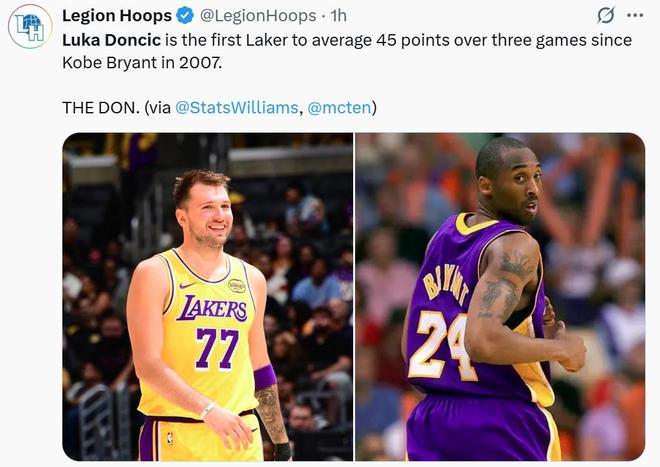 他也成为07年科比之后,湖人队首位在开季前三场比赛中场均拿下45分的球员。 本场再度拿下40+后,东契奇生涯已经49次单场砍下40+,追平“大鲨鱼”奥尼尔。