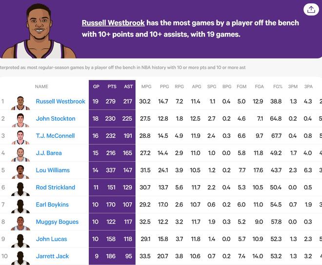 本场比赛,国王替补后卫威斯布鲁克出场33分33秒,14投4中得到了12分10助攻5篮板2抢断,三分球5中0,罚球4中4,出现了1次失误和5次犯规,正负值为全场最高的+14。 本场比赛是威少职业生涯第19次替补拿到10+分和10+助攻,据统计,威少是目前NBA历史上做到该成就次数最多的球员。此前威少与爵士名宿约翰-斯托克顿并列排在该榜单第一位。