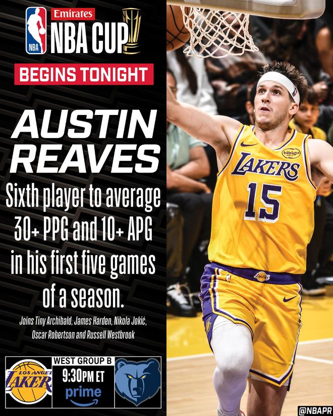 里夫斯开赛前5场场均得分30+助攻10+,历史第六位