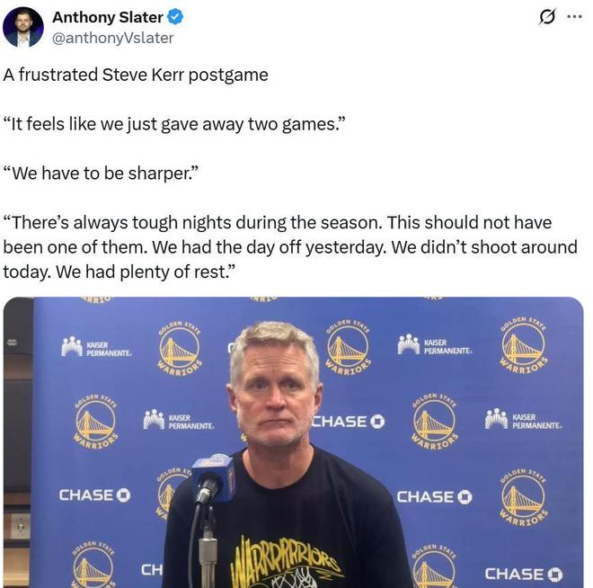 勇士遭逆转吞连败 在前一场爆冷不敌字母哥缺阵的雄鹿队后,勇士队迎来与步行者队的较量,后者作为上个赛季的亚军,本赛季遭遇严重伤病困扰,不仅哈利伯顿赛季报销,内姆哈德、托平、马瑟林、麦康奈尔等核心球员也均因伤缺席,开季0胜5负难求一胜。 结果面对这支残阵鱼腩,勇士队在全场大部分时间领先的情况下,末节惨遭逆转109-114又爆冷输掉了一场本应拿下的比赛。 勇士遭遇这样一场爆冷逆转三人难辞其咎,主帅科尔惩罚式用人坑惨核心库里。