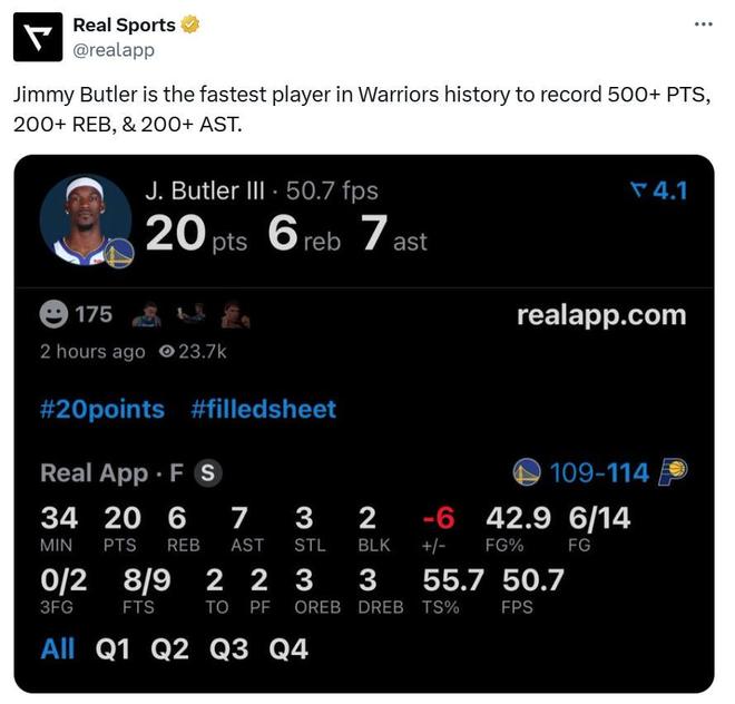 巴特勒破纪录燃尽 在库里与追梦状态如此糟糕的情况下,勇士队之所以还能在大部分时间与步行者打得有来有回,甚至末节节中一度领先两位数,巴特勒可谓是燃尽了。 全场巴特勒高效砍下20分6板7助3断2帽,加入勇士以来仅用37场就拿到688分204板210次助攻,成为勇士队史达成500分200板200助攻最快的球员。