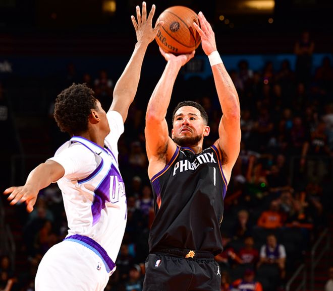湖人赢球后4胜2负,排名从西部第六变成第五,灰熊输球后3胜3负,排名从西部第七变成第八。 太阳主场迎战爵士,太阳缺少了杰伦格林、狄龙,爵士缺少了科利尔,虽然太阳战力折损更大,但太阳全场压制爵士,一度领先25分,最终大胜了22分。布克23中13(三分9中6)得到36分6板9助,马尔卡宁20中10(三分11中4)得到33分4板。