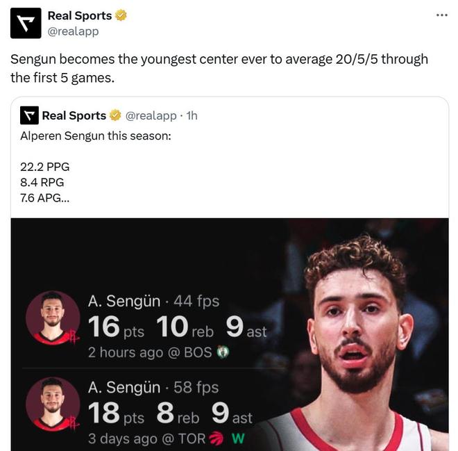 回到舒适区的申京自然大发神威,本场轻松交出16分10板9助1断2盖帽准三双数据,传导球与策应能力让人眼前一亮。 除此之外,申京在本赛季明显提高三分投射威胁与罚球稳定性,让其在进攻端的可靠性大幅提升。 开赛至今,申京场均可以拿到22.2分8.4篮板7.6助攻,真实命中率60.3%,凭借这样的表现,23岁100天的申京成为NBA历史上能够在开季前五场场均拿到至少20分5篮板5助攻最年轻的中锋。