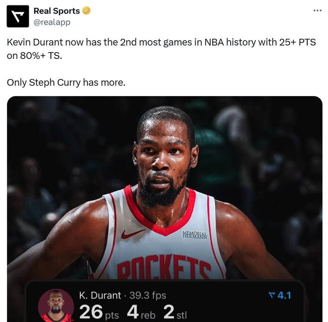 杜兰特追平哈登 另外一位明显受益的球员是杜兰特,当火箭队体系运转起来后,杜兰特终于不用苦哈哈依靠个人强攻扛着球队前进。 全场杜兰特11中9轻松拿下26分4篮板1助攻2抢断2盖帽,仅出战29分钟三大打卡拿下胜利。 凭借这样的表现,杜兰特生涯已经第67次砍下25+且真实命中率80+%,追平哈登并列历史第二,仅次于库里的100次。
