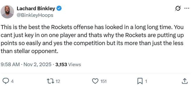 杜兰特之所以打得如此轻松,根本原因是火箭队在进攻端多点开花7人上双,对手完全无法针对KD。 正如火箭记者Lachard Binkley赛后所说,火箭队本场打出了让人惊叹的进攻表现,已经记不清休城上一次打出这种表现是什么时候。 对手完全没办法针对某一个球员,这是他们可以在进攻端轻松得分的原因,对手的实力固然不足,但绝对不是仅仅因为这一点。