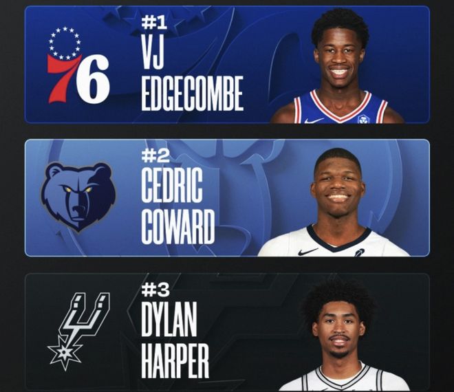76人的探花秀埃奇库姆表现惊艳,场均40分钟的出场时间,21.2分、5.6板、5.4助攻,投篮命中率接近5成,三分接近44%,排在今年新秀最新榜第1位。4号秀是黄蜂的克努佩尔,场均12.3分、4.7板、1.8助。5号秀是爵士的贝利,场均4.4分、3.6板、1.8助。奇才的约翰逊场均13分、3.3板,是今年的6号秀。