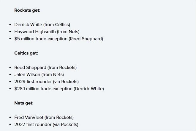 交易具体方案—— 火箭队获得: 德里克-怀特(来自凯尔特人队) 海伍德-海史密斯(来自篮网队) 500万美元交易特例(来自里德-谢泼德的合同) 凯尔特人队获得: 里德-谢泼德(来自火箭队) 杰伦-威尔逊(来自篮网队) 2029年首轮选秀权(来自火箭队) 2810万美元交易特例(来自德里克-怀特的合同) 篮网队获得: 弗雷德-范弗利特(来自火箭队) 2027年首轮选秀权(来自火箭队) 为何火箭队愿意做这笔交易