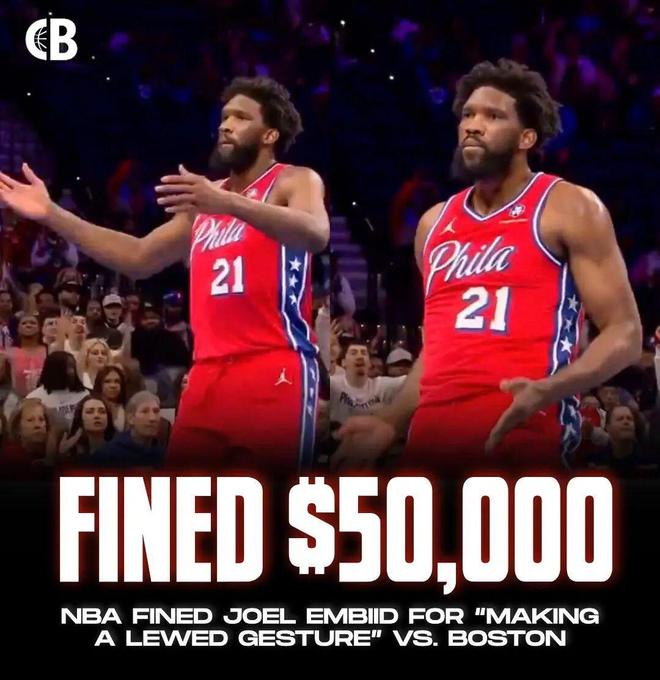 今天,NBA官方宣布, 恩比德因不雅庆祝动作,被联盟罚款5万美元。 一个不雅庆祝动作被罚5万美元,按今天的汇率是355870人民币,我三年的税后工资 。 大帝这是触犯了天条? 打凯尔特人,恩比德命中了一个平平无奇中距离且造成了对手犯规 洋洋得意的大帝做了一个庆祝动作 就是这个动作,被官方认定是 猥亵手势(lewd gesture)” 不吹不黑,大帝的庆祝动作真的是夏候惇看电影,眼光独到 这个庆祝动作,NBA是明令禁止的,此前他就因为这个动作,多次遭到NBA的重罚。