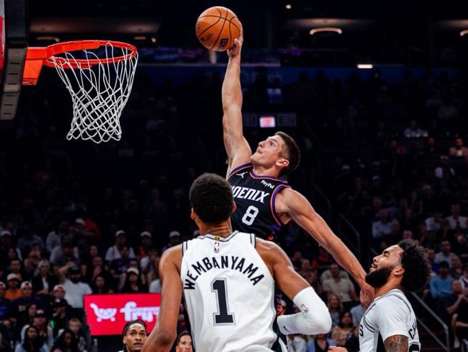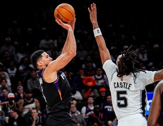 NBA常规赛,太阳坐镇主场迎战马刺。本场比赛之前,马刺5胜0负排名西部第2,新赛季还没有输过。从前几场比赛来看,文班亚马确实太无解,身高臂长,攻防两端都有恐怖的影响力;场均轰出30.2分14.6篮板3.4助攻4.8盖帽,场均篮板和场均盖帽皆为联盟第一,估计其他球队都在紧急寻找对付文班的办法,不可能拿捏不了一个三年级的年轻球员吧? 另一边的太阳队,2胜4负排名西部第11,太阳刚结束了他们的三连败;休赛期送走比尔和杜兰特之后,今年太阳冲击季后赛希望渺茫,布克一人带队,全靠造化了。