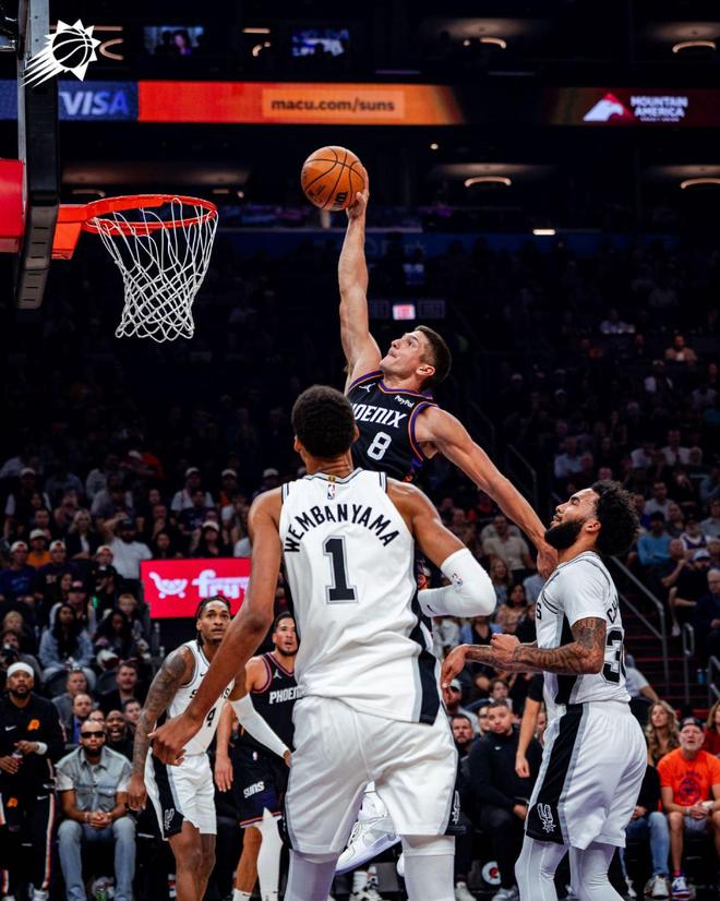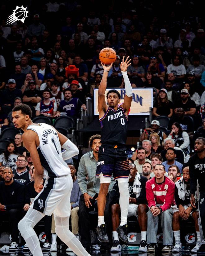 马刺队,卡斯尔16中10空砍26分7板5助2断、凯尔登约翰逊14中8轰下19分3板2助、巴恩斯13分4板2助、哈珀12分1板,因伤退场。布莱恩特10分1板2断、尚帕尼9分5板1助2断、米尼克斯9分1板、瓦塞尔9中2,三分球6中0得到4分3板2助、麦克劳林3分2板4助2断。 大爆冷门!马刺完败太阳 此战之前,菲尼克斯排名西部第11位,而圣安东尼奥则高居西部第2。在排名与实力均远不及对手的情况下,太阳12分完胜,并几乎全场压制马刺,可谓是上演了以弱胜强、以下克上、大爆冷门的好戏。 文班亚马9+9+4+6失误 马刺队超级新星文班亚马,在此役表现低迷。文班亚马上场34分钟,14投仅4中,5中1,0罚球,得到9分9篮板2助攻1抢断4盖帽,出现6失误4犯规。文班亚马全场遭遇强势包夹,难以获得轻松取分机会。此外,马刺外线表现低迷,让文班亚马在禁区的得分变得更加困难。 马刺队文班亚马