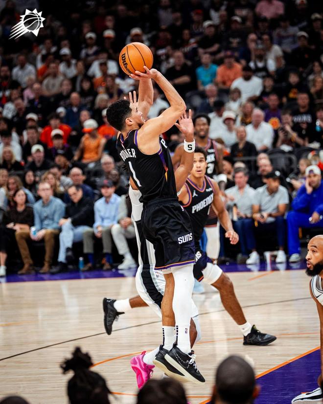 此役,文班亚马仅有28.5%的投篮命中率,三分球命中率跌至20%。文班亚马还出现了全场最多的6次失误,他需要更好的破解对手的包夹战术。不过,文班亚马在防守端依旧存在感十足。作为此战的篮板王和盖帽王,文班亚马在防守端威慑力十足。 布克28+13暴走 太阳队当家球星德文布克,此役强势暴走。布克出战35分钟,15投10中,三分2中2,罚球6中6,狂砍28分2板13助攻1抢断的大号两双数据,正负值+26高居全场第二。 德文布克