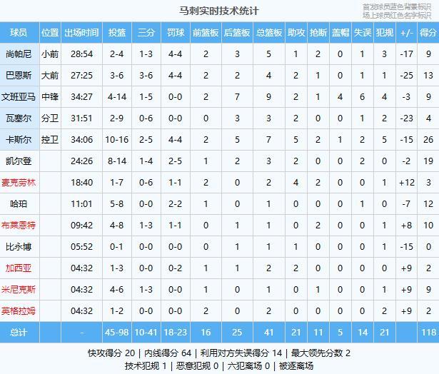 马刺数据(客队):卡斯尔26分7板5助2断、凯尔登19分3板2助、巴恩斯13分4板2助、哈珀12分1板、布莱恩特10分1板2断、文班亚马9分9板2助4帽、尚帕尼9分5板1助2断、米尼克斯9分1板、瓦塞尔4分3板2助 太阳数据(主队):布克28分2板13助、邓恩17分5板1助、阿伦17分3板3助、吉莱斯皮15分2板4助、奥尼尔11分6板4助2断、古德温11分3板2助2断、理查兹10分3板2助、威廉姆斯7分7板2助2帽、伊戈达罗4分5板2助