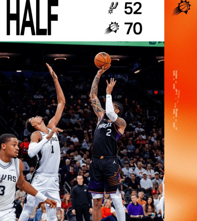 次节回来,阿伦过掉防守想要上篮,文班亚马补防直接大帽扇飞,布克接边线球弧顶果断三分出手干拔命中,目前三分2中2已经砍下10分6助攻。布克突破吸引包夹直吊禁区,理查兹篮下接球完成单臂隔扣,阿伦、古德温连续三分投进,目前太阳三分14中10,已经将分差拉开至17分,打崩马刺队。文班亚马篮下左手大帽威廉姆斯,随后放篮打进拿到本场首分。布克身后撞倒文班亚马被吹犯规,卡斯尔怒喷古德温被吹技术犯规,半场战罢,太阳70-52领先马刺18分。