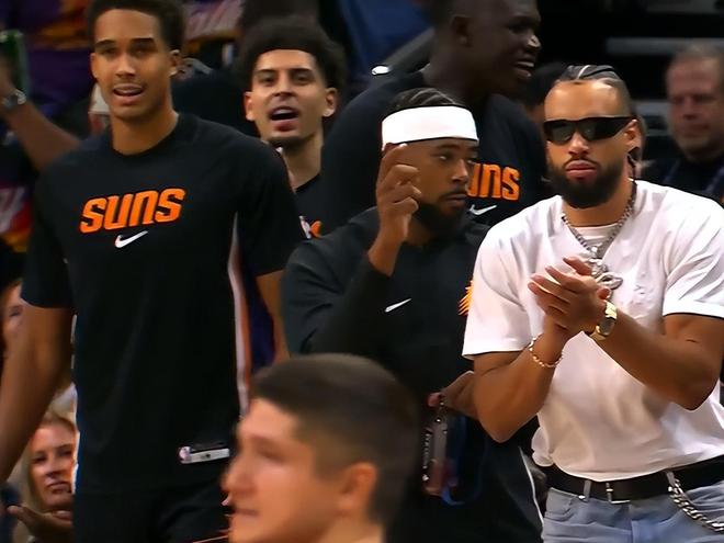 本场比赛,首发阵容方面,太阳队这边,杰伦-格林(右腿腿筋拉伤)、狄龙-布鲁克斯(核心肌肉拉伤)、以赛亚-利弗斯(右髋部挫伤)缺阵,主帅基德排出的首发五人组为:布克、阿伦、邓恩、奥尼尔、马克-威廉姆斯;马刺队这边,福克斯、索汉、科内特、奥利尼克和沃特斯三世因伤缺席本场比赛,首发阵容则为:斯蒂芬-卡斯尔、德文-瓦塞尔、朱利安-尚帕尼、哈里森-巴恩斯、维克托-文班亚马。