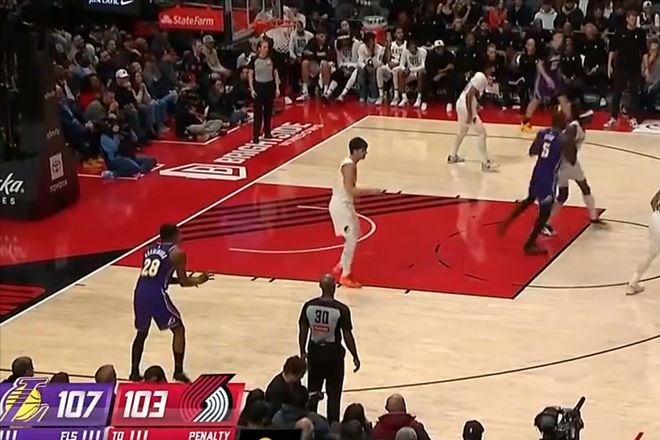 首节,阿夫迪亚连续失误,湖人连续取分,八村塁连续快速反击暴扣取分。卡马拉命中首记三分,艾顿面对旧主频频得分,替补中锋罗威抢断对手发球直接反击暴扣。阿夫迪亚也有三分,随后又是反击造犯规。阿夫迪亚又正面硬刚八村塁制造投篮犯规。首节开拓者33比24领先。阿夫迪亚单节11分,艾顿8分。 次节,八村塁率先命中三分,卡马拉三分再中,分差拉开到两位数。八村塁三分还进,罗威篮下取分。史密斯连续三分持续追分,上半场开拓者53比52一分领先。阿夫迪亚14分4失误,格兰特10分,湖人最高分八村塁已经18分,艾顿13分。杨瀚森暂未登场。 易边再战,开拓者率先取分,阿夫迪亚终于帮助球队命中三分,艾顿勾手也进。没有想到多名主力缺阵的湖人也能跟对手打得有来有回。克林根面对艾顿打得十分吃力,被罗威换下。湖人在这波攻势之下反超比分。史密斯成为湖人队的进攻核心,帮助球队建立领先优势。三节打完湖人反超4分。史密斯已经15分。