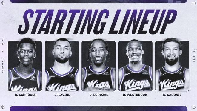 国王这赛季的阵容大家都知道,非常畸形,能持球和需要球的球员非常多,后卫线可以打两桌麻将,锋线本来严重缺人,基根穆雷还伤了。 于是你会看到,这场国王派出的首发是:施罗德+拉文+德罗赞+威少+小萨博尼斯——1个内线和4个后卫,其中还有多个防守弱环,威少在这套阵容里顶替的是基根穆雷。