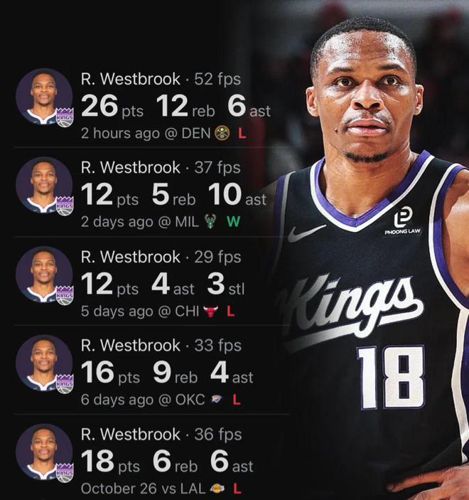 注意这个数据,开赛至今: ——威少在场时,国王百回合得分114.3分,失分116.4分,净负对手2.1分 ——威少不在场,国王百回合得分111.0分,失分119.0分,净负对手8.0分 国王本来就不是一支强队,本赛季开赛预测很少有媒体或者球迷认为他们会进季后赛,所以目前2胜5负的战绩也算正常,威少虽然在场无法带队赢分,但至少比他不在场要好。