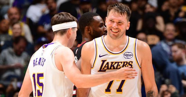 三、湖人(5胜2负) 上期排名:6 湖人在卢卡-东契奇缺阵期间取得2胜1负。随着东契奇在上周末回归并率队再取两胜,其个人场均得分已攀升至41.3分。 三大关键点: 1、截至上周日之前,湖人是全联盟唯一一支从未在外线得分上压倒对手的球队。但在昨日战胜热火一役中,他们终于在外线净胜对手18分。东契奇虽然三分11投仅1中,却送出6记三分助攻,更惊人的是本赛季他在油漆区41投34中(命中率83%)的恐怖效率,而其中仅有一次灌篮。 2、杰克-拉拉维亚上周四对阵森林狼11投10中砍下27分,昨日迎战热火又13投10中斩获25分。这位生涯累计出战143场的球员,此前仅在上赛季灰熊黯淡的收官阶段两次达成单场10+进球。此外,他在防守端亦有出色发挥,赛季迄今以28次破坏传球暂列联盟第五。 3、布朗尼-詹姆斯在昨日获得了轮换时间,终场阶段与东契奇、拉拉维亚和奥斯汀-里夫斯共同在场并帮助球队锁定胜局。此役他得到2分2助攻并送出3次抢断,更曾在反击中接里夫斯妙传完成空接灌篮。